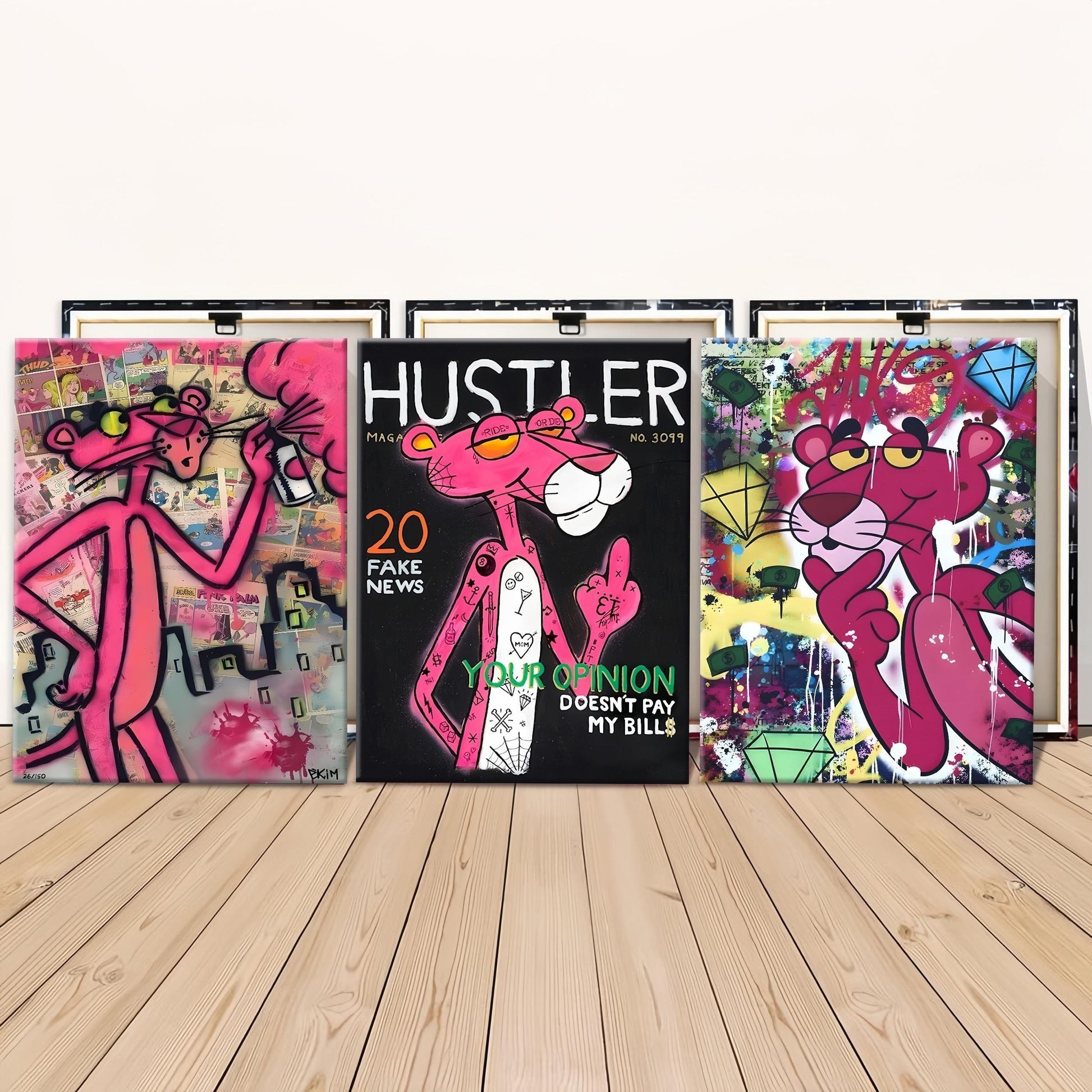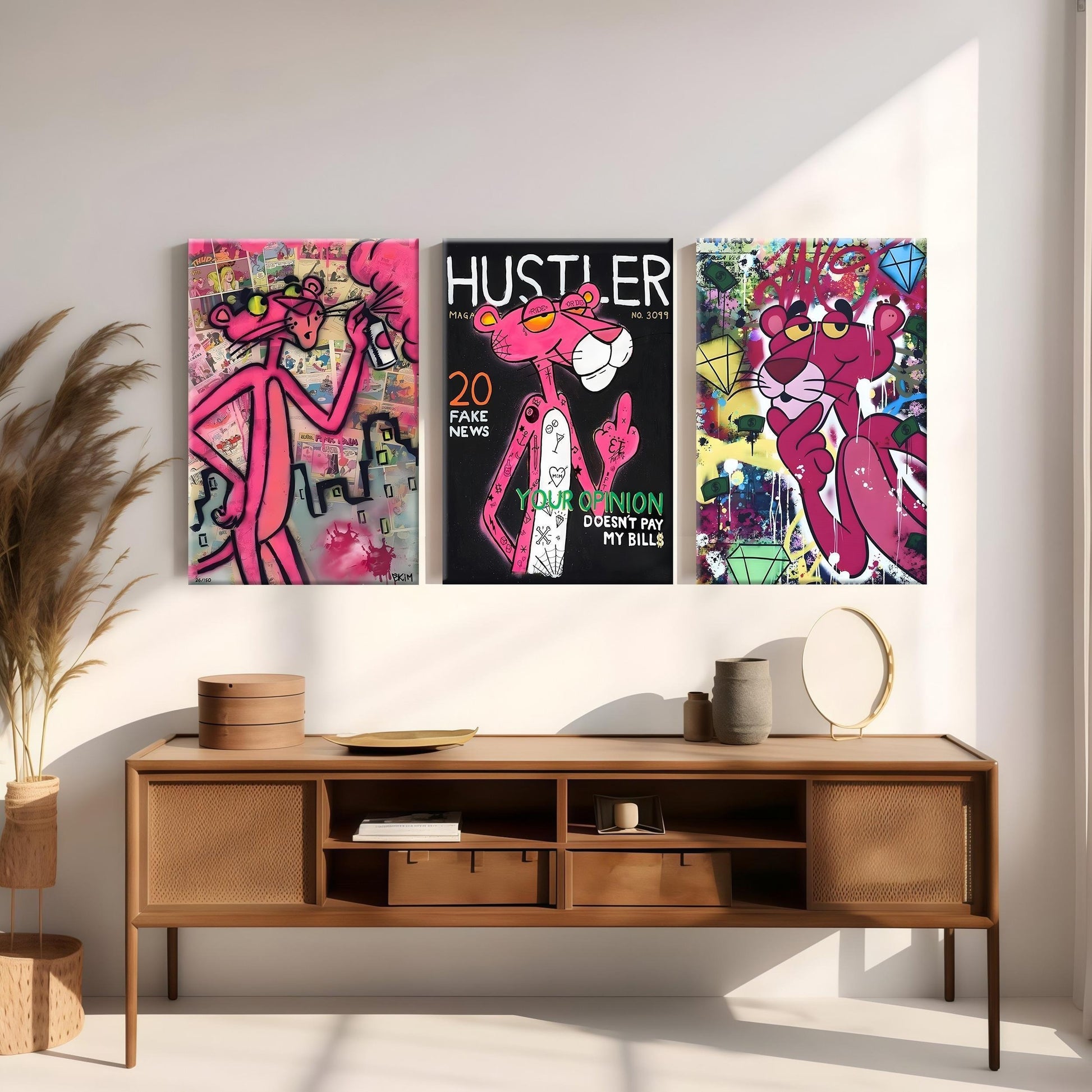 Set of 3 Pink Panther graffiti art prints ¨C trendy modern wall decor for dorms, bedrooms, or game rooms.