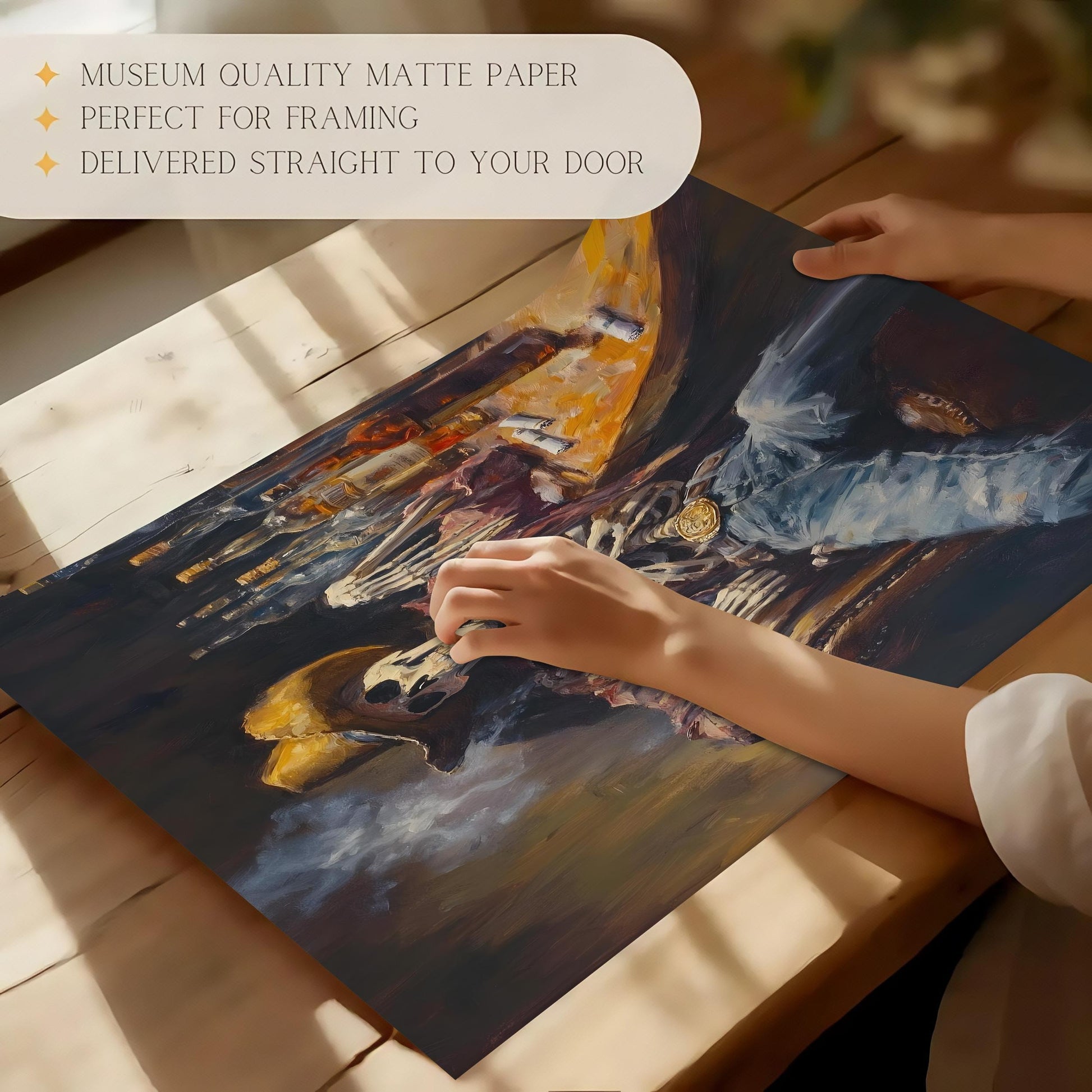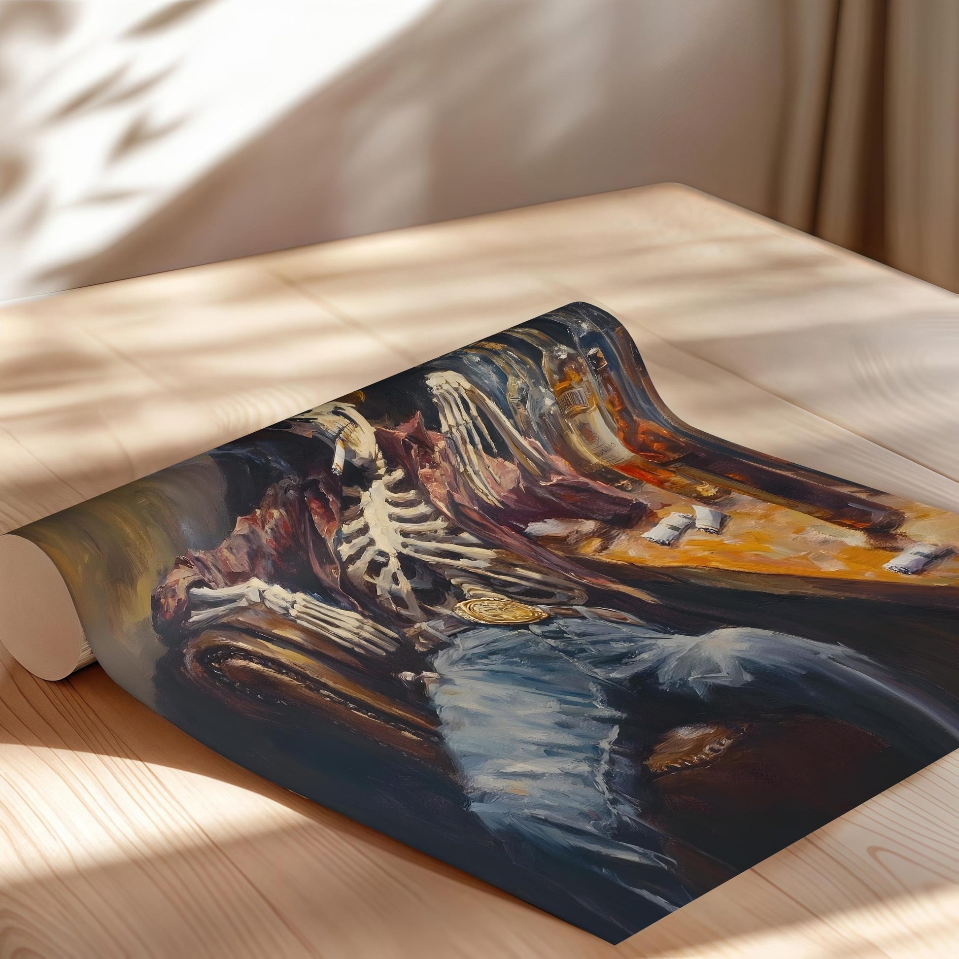 Vintage oil painting of a skeleton cowboy in a western bar ¨C rustic western wall decor for home, bar, or man cave.