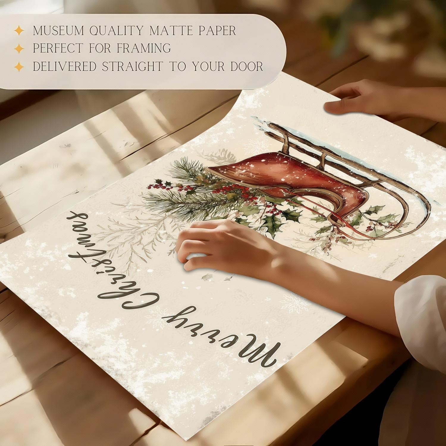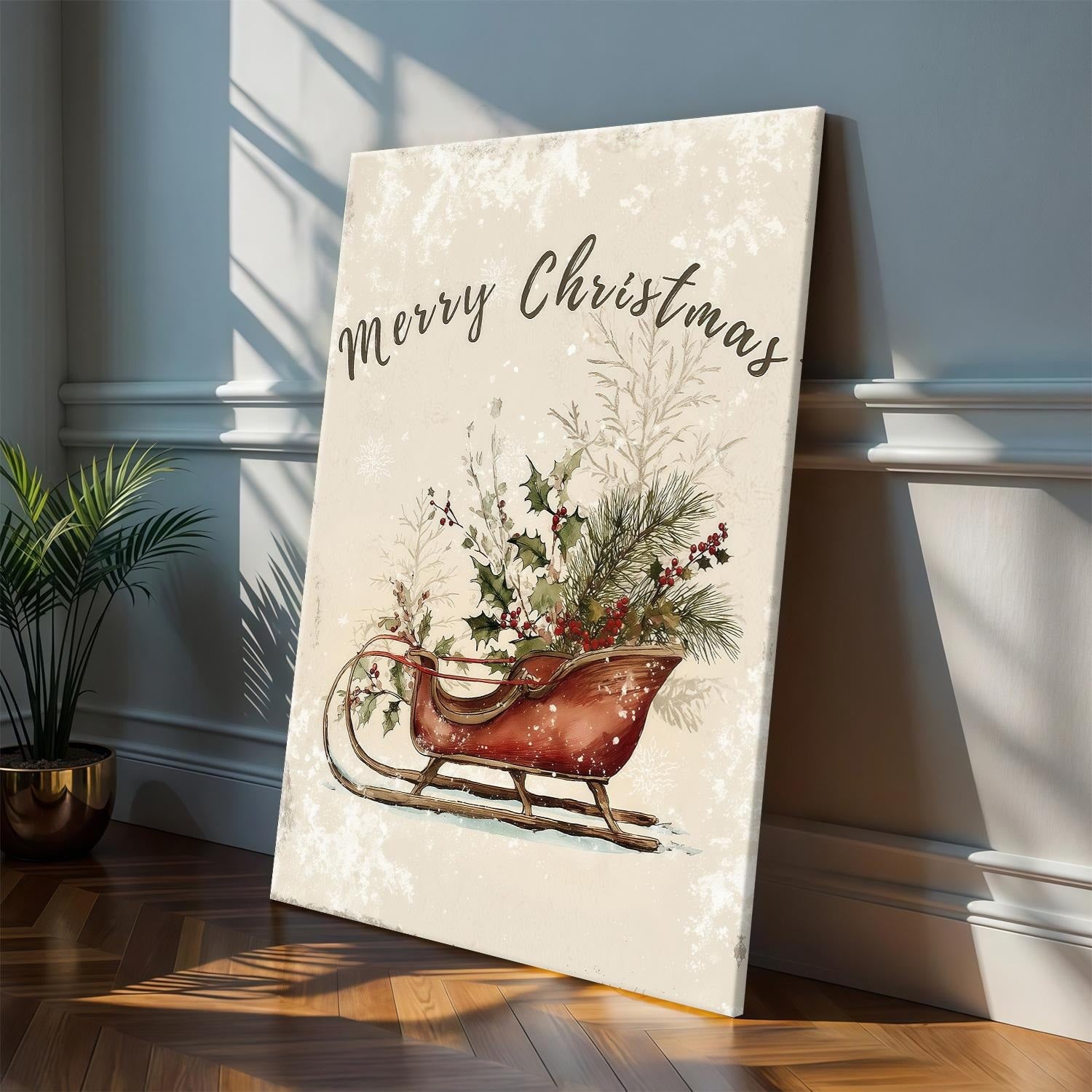 Vintage Christmas sleigh print with holly ¨C warm rustic decor for winter home interiors.